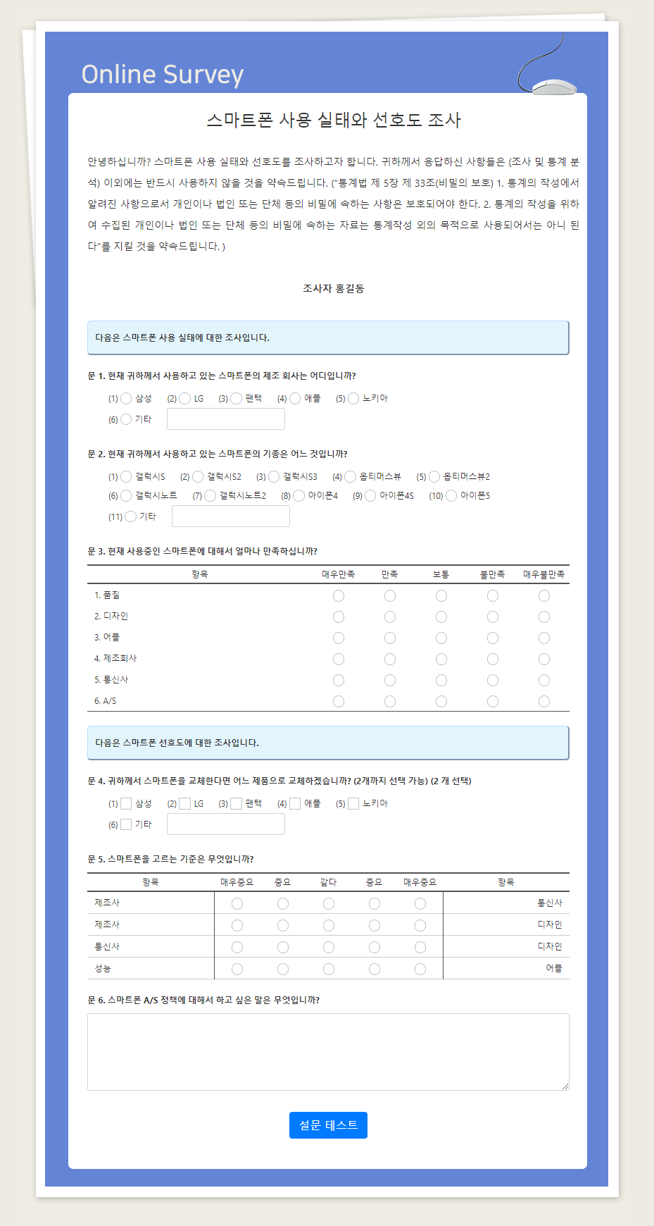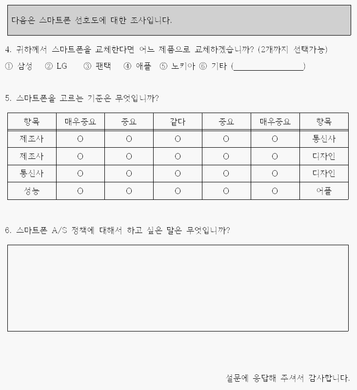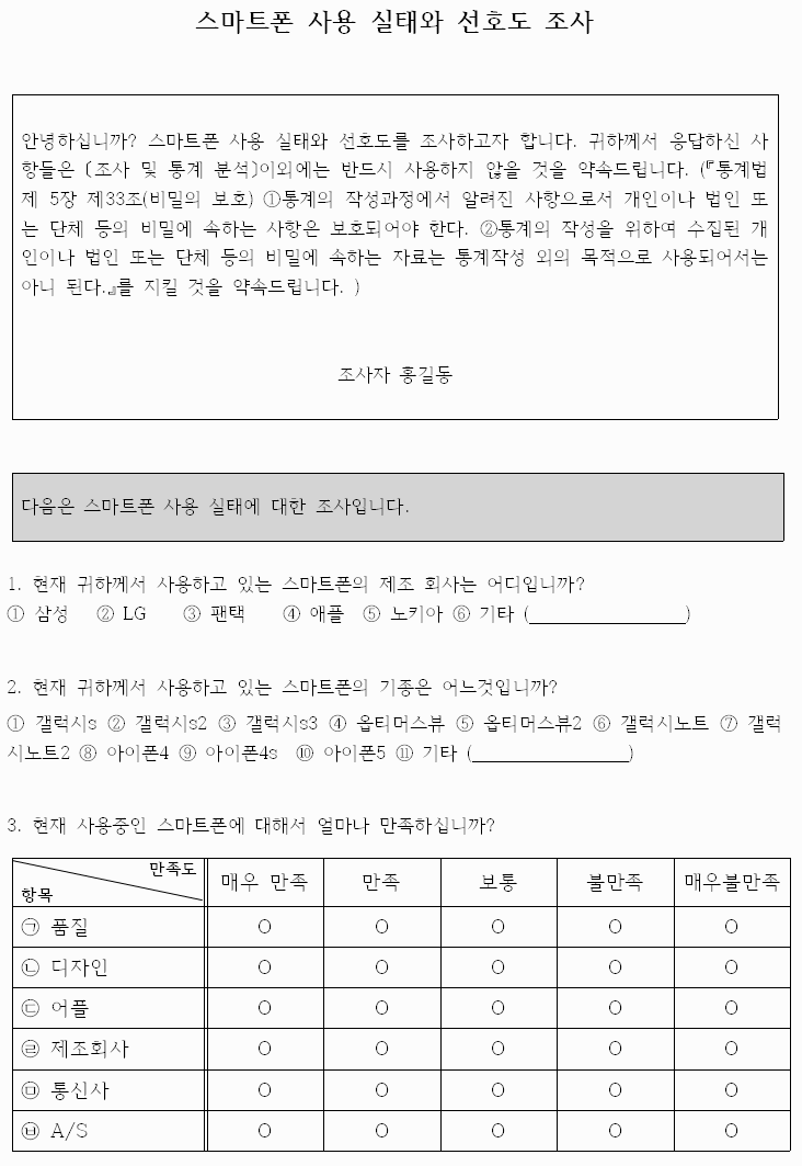아래의 문서로 작성된 설문을 이용하여 올서베이넷에서 실제 설문을 만드는 과정을 살펴보도록 하겠습니다.