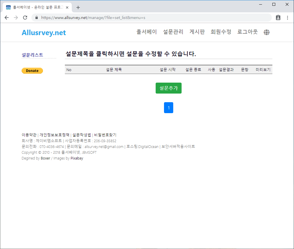 설문을 추가할 수 있는 버튼과 올서베이에서 생성한 설문의 목록을 보여줍니다. 목록에서 나타나는 설문을 클릭하면 설문 세부 설정 및 문항 입력을 할 수 있습니다.