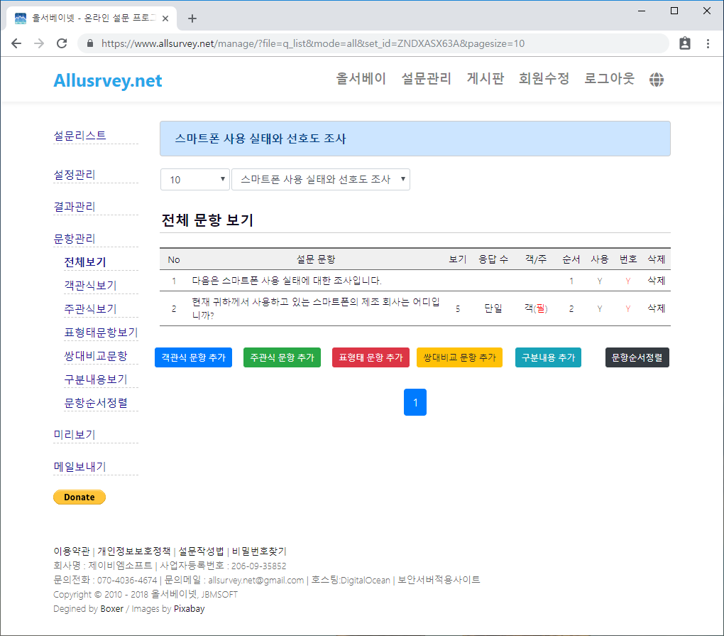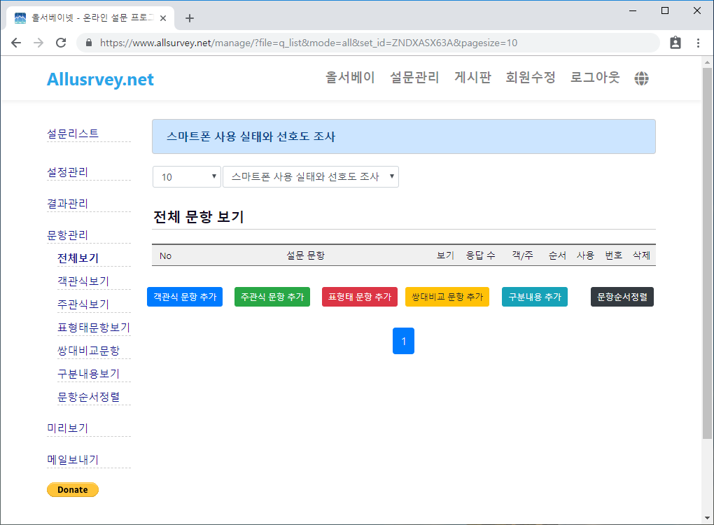 설문을 설정하고 나면 문항을 입력할 수 있습니다. 문항관리는 문항을 입력할 수 있는 버튼을 보여주고, 입력된 문항 전체 리스트를 제공합니다.