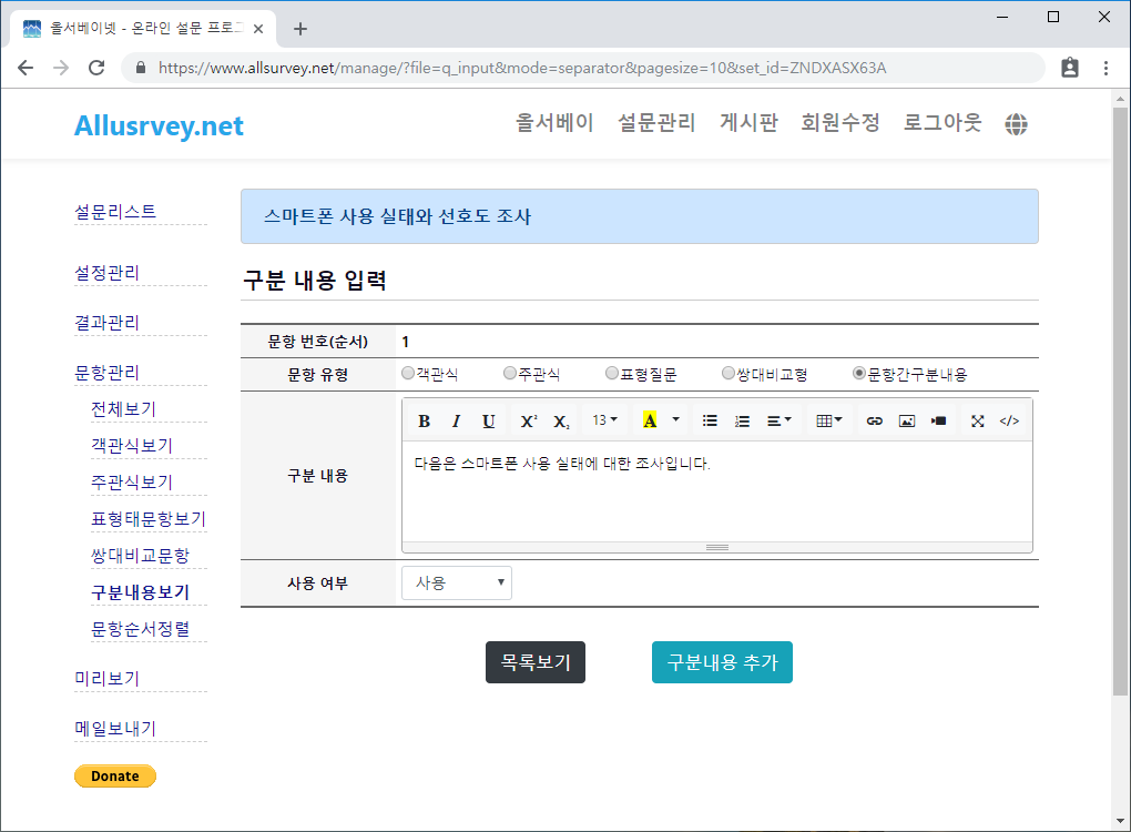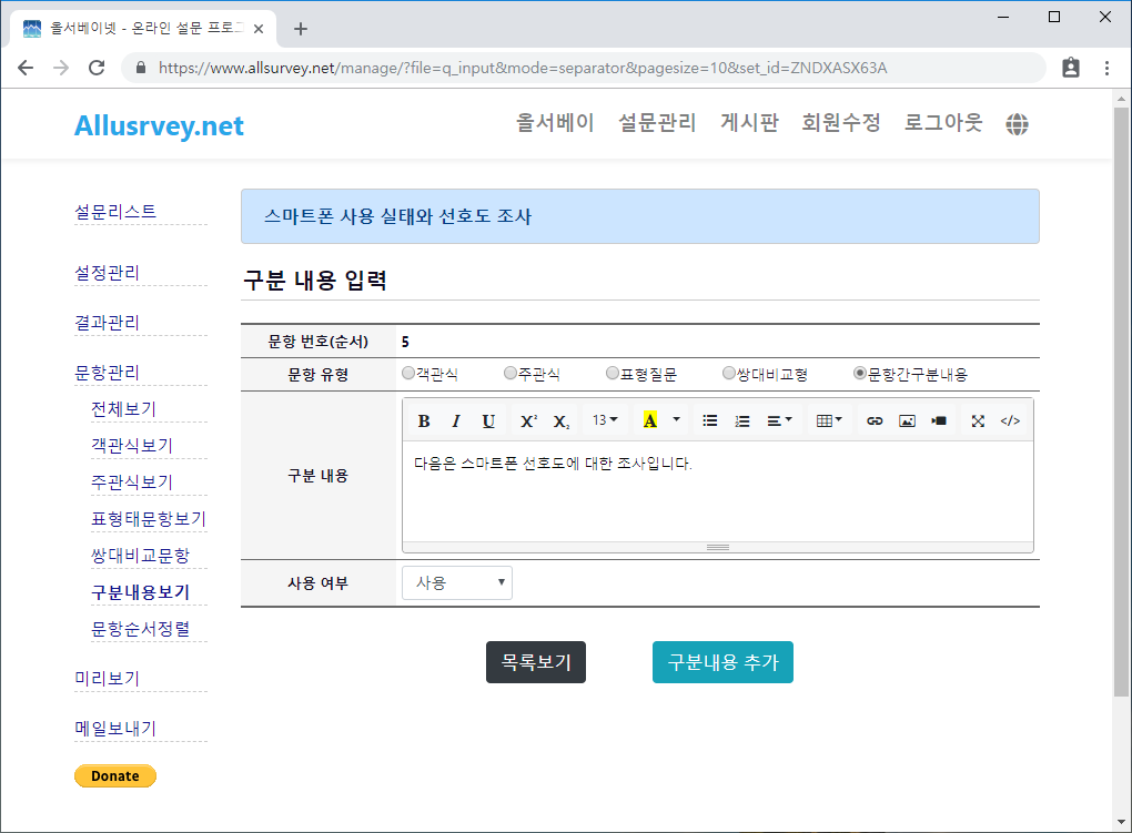 구분내용은 문항과 문항사이에 설명을 삽입하고자 하는 경우나, 문항의 부류를 구분하기 위해서 문항 사이에 내용만을 입력하는 항목입니다. 구분내용 보기는 구분내용 문항 리스트를 보여줍니다.