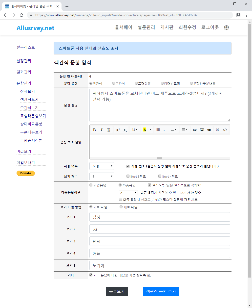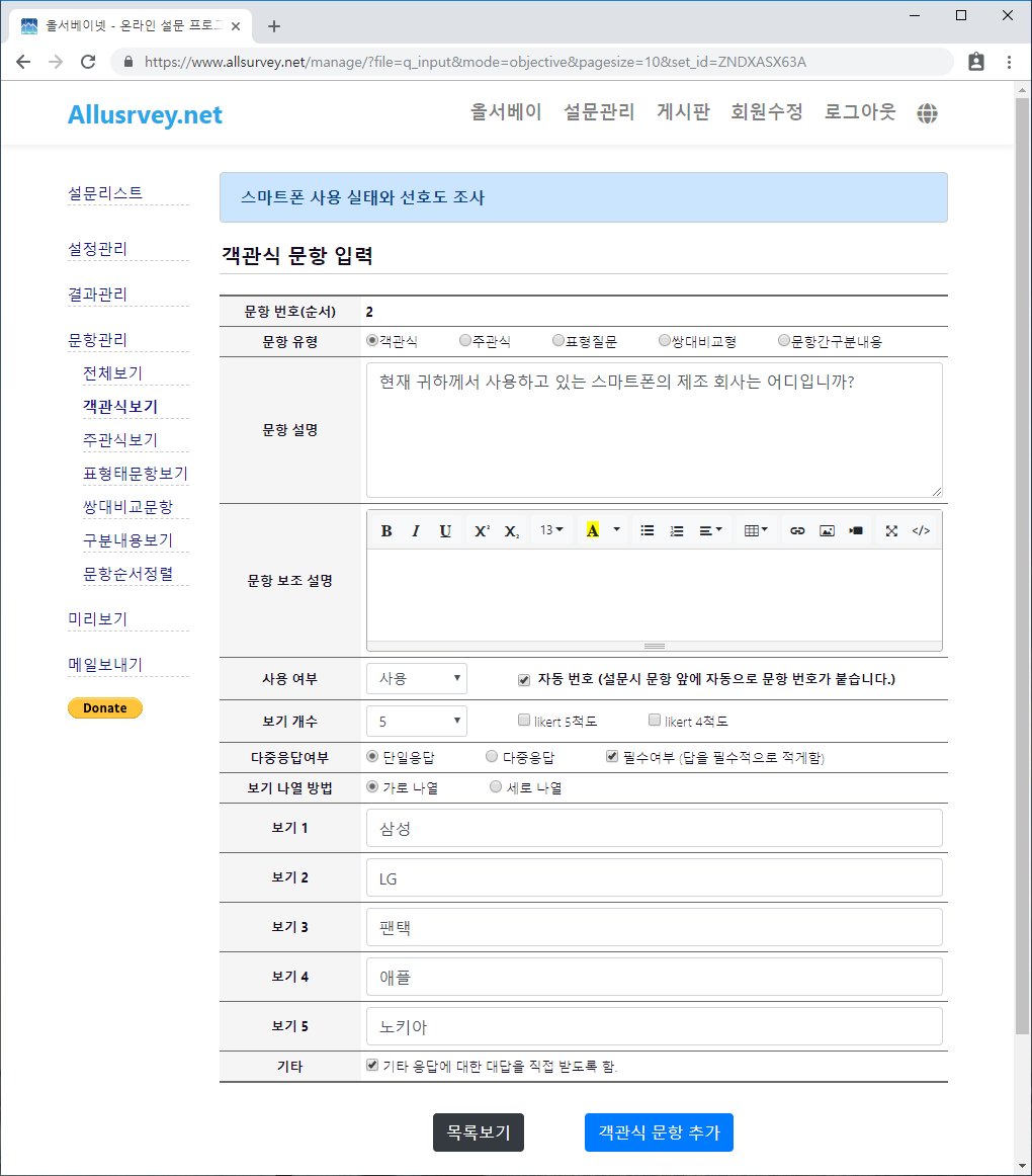 - 두번째 객관식 문항 내용을 입력합니다. 보기 개수는 "10"개 이며, 단일 응답, 가로 나열, 기타 항목에 체크를 하도록 합니다. "객관식 문항 추가" 버튼을 눌러 저장을 합니다.