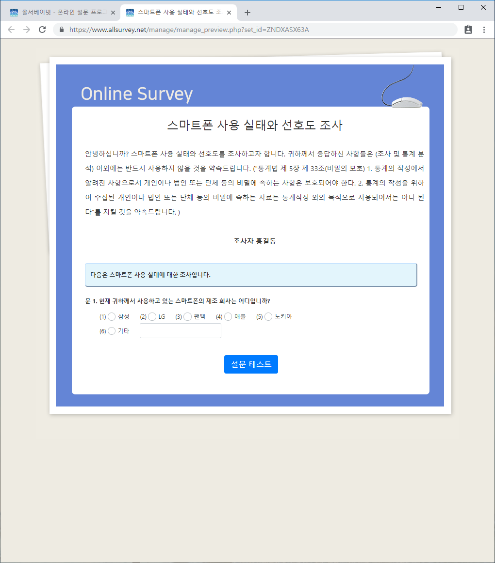 미리보기는 설문을 설정하고 문항을 입력한 상태를 미리보여주는 새로운 창을 열어줍니다. 본인이 작성한 설문과 웹상에서 나타나는 설문이 일치하는지 확인하면서 작업을 할 수 있습니다.