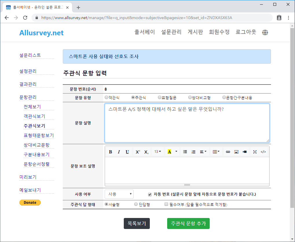 주관식보기 메뉴는 현재 입력된 문항중에서 주관식 문항만을 보여줍니다.
