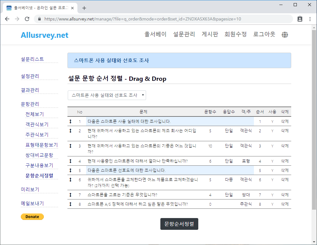 문항의 순서를 변경할 수 있습니다. 변경할 문항에 마우스를 클릭하여 드래그 앤 드랍으로 순서를 변경하고, 문항순서정렬 버턴을 눌러 저장을 합니다. 실제 설문 내용은 정렬된 순서로 나타나게 됩니다.